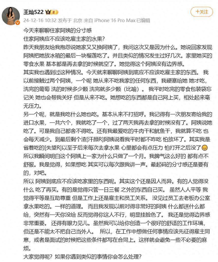 文末,王灿表示:“虽然人人平等 我觉得平等是互助尊重,但是工作上还是雇主和员工关系。我还是觉得边界感非常重要。还得有眼力见儿。虽然我可以给你创造一个很好的舒适的工作环境,但还是不能太不把自己当外人。所以,在工作中想做任何事情应该先征得雇主同意,或者是面试的时候把这些条件都写在合同上。这样就会避免一些不必要的麻烦。”