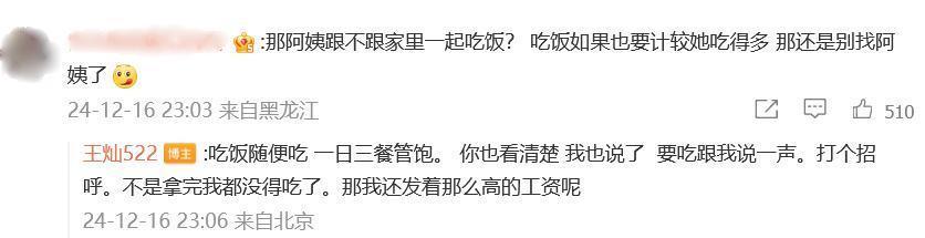 有网友称“吃饭如果也要计较她吃得多,那还是别找阿姨了”,王灿回复:“吃饭随便吃,一日三餐管饱。要吃跟我说一声。”